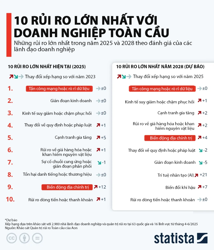 Dựa trên Khảo sát Quản trị Rủi ro Toàn cầu 2025 của tập đoàn Aon (Anh), đồ thị dưới đây thể hiện 10 rủi ro lớn nhất theo đánh giá của các nhà lãnh đạo và chuyên gia quản trị rủi ro doanh nghiệp trong năm 2025, cùng dự báo đến năm 2028.